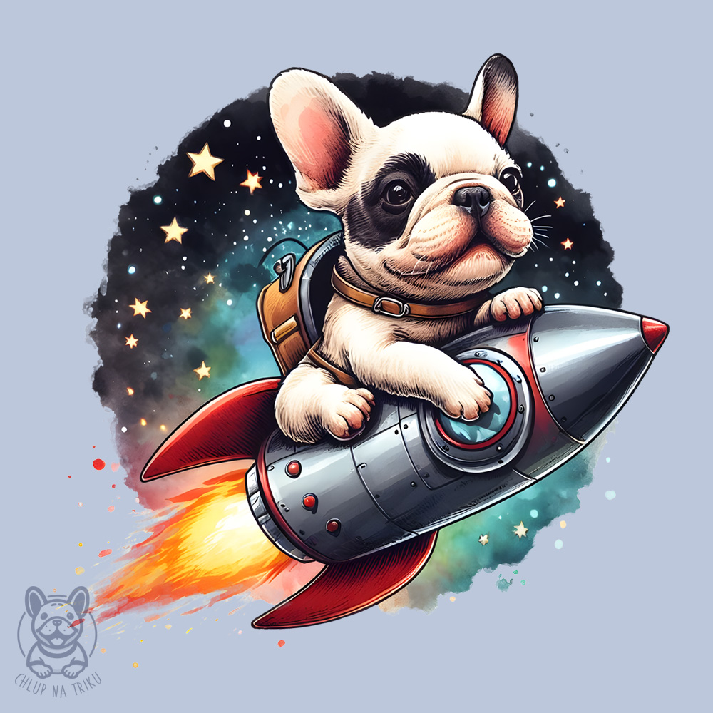 Roztomilý francouzský buldoček pilotující raketu ke hvězdám. Připoj se i ty k jeho vesmírnému dobrodružství. Tričko nejen pro majitele těchto ušatých pejsků.